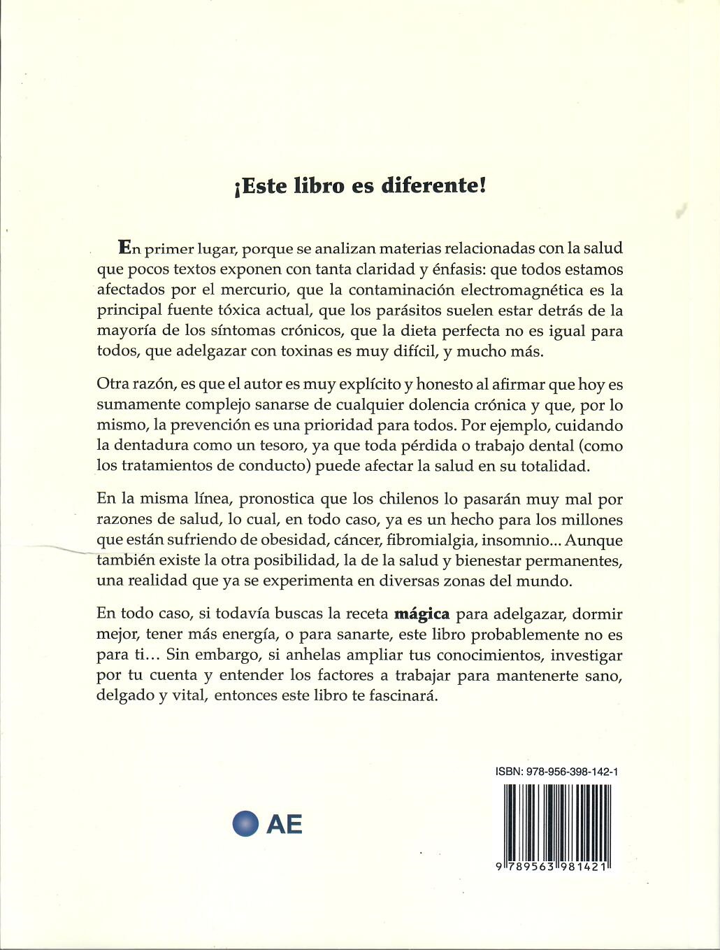 Este libro es diferente. En primer lugar, porque se analizan materias relacionadas con la salud que pocos textos exponen con tanta claridad y énfasis: que todos estamos afectados por el mercurio, que la contaminación electromagnética es la principal fuente tóxica actual, que los parásitos suelen estar detrás de la mayoría de los síntomas crónicos, que la dieta perfecta no es igual para todos, que adelgazar es muy difícil, y mucho más. Otra razón, es que el autor es muy explícito y honesto al afirmar que hoy es sumamente complejo sanarse de cualquier dolencia crónica y que, por lo mismo, la prevención es una prioridad para todos.